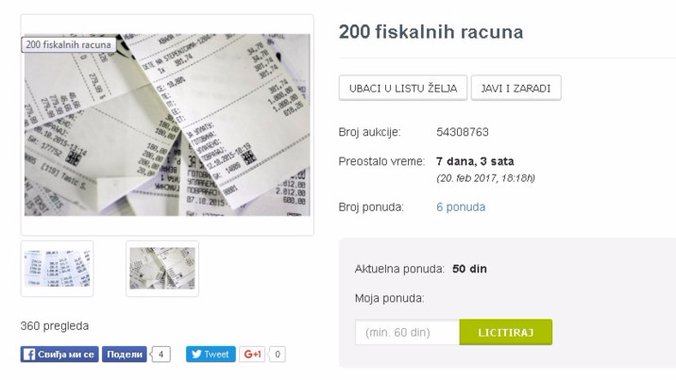 - Prodajem 200 fiskalnih računa pogodnih za aktuelnu nagradnu igru. Svi su od ovog meseca i preko sto dinara. Srećno na ovoj licitaciji i srećno u nagradnoj igri - navodi se u oglasu.