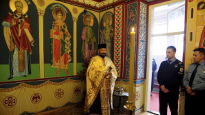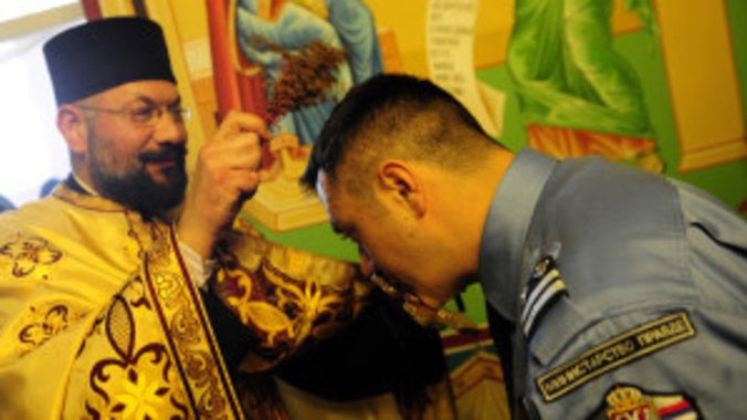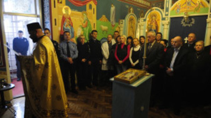 Foto: Beograd, 6. januara 2016. - Zatvorski sluzbenik celiva krst tokom obelezavanja Badnjeg dana u Okruznom zatvoru u Beogradu gde je po prvi put u tu zavodsku ustanovu unet badnjak. FOTO TANJUG/ TANJA VALIC/ bk