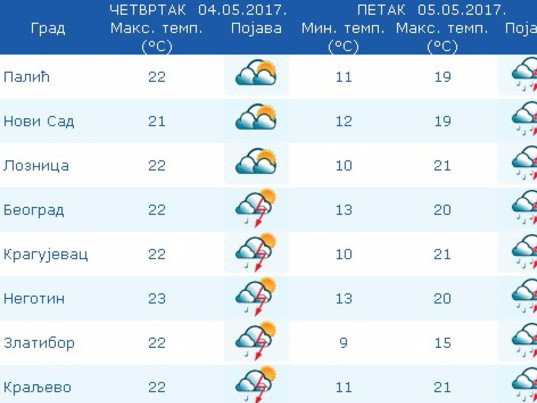 Vetar uglavnom slab, promenljivog smera, u zoni pljuskova pojačan. Najniža temperatura od 9 do 14 C, najviša od 18 do 23 C, saopštio je Republički hidrometeorološki zavod.