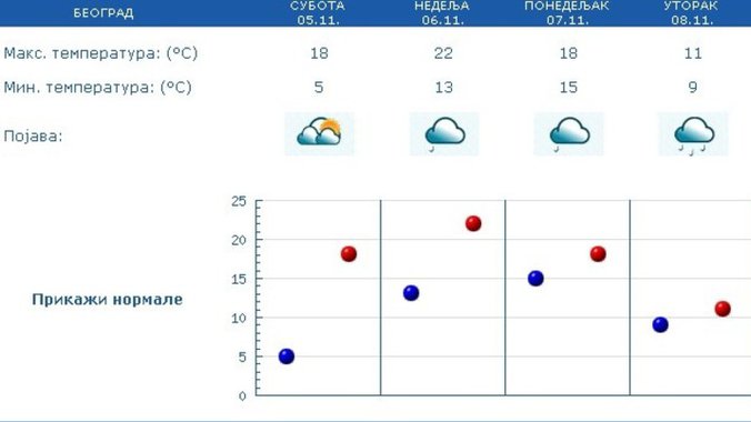 Vetar će biti slab i umeren južni i jugoistočni, uveče i u noći u pojačanju. Jutarnja temperatura biće od 1 do 5 C, najviša dnevna oko 18 C.