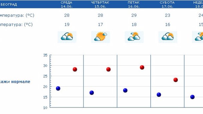 I u Beogradu će danas biti umereno do potpuno oblačno, uz slab do umeren vetar, a sredinom dana moguća je kratkotrajna kiša ili pljuskovi s grmljavinom. Jutarnja temperatura biće oko 19, a najviša dnevna oko 28 stepeni.