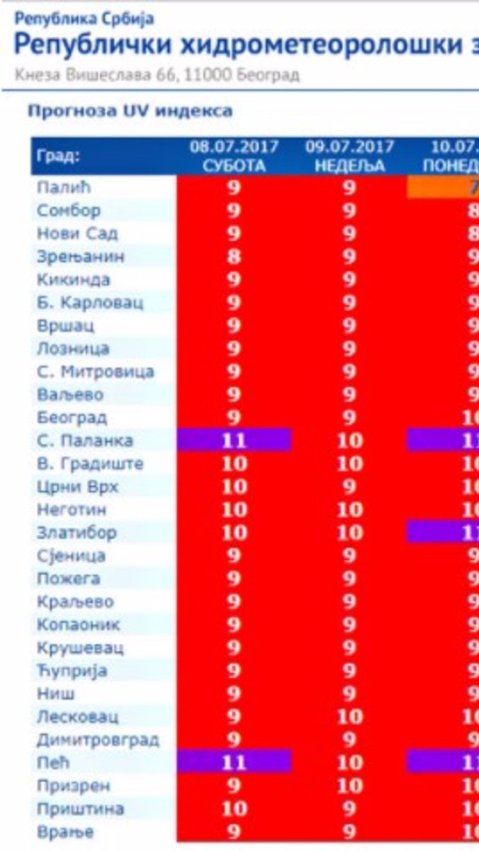 Indeks UV zračenja ovih dana biće ekstremno visok, pa se pripazite štetnih posledica jakog sunca – opekotina, sunčanice, toplotnog udara. Najgore će biti građanima koji žive u Smederevskoj Palanci, Negotinu, na Zlatiboru, u Velikom Gradištu…