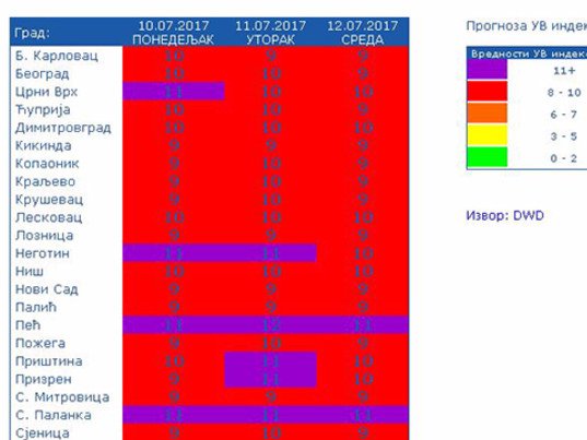 Osim ekstremno visokih temperatura, i UV indeks je na jako visokom nivou, te se savetuje građanima da bez preke potrebe ne izlaze iz kuće u najtoplijem periodu dana, od 11 do 17 časova. Najkritičnije će biti u Peći i to sutra, kada će UV indeks iznositi čak 12, što se smatra ekstremno visokim.