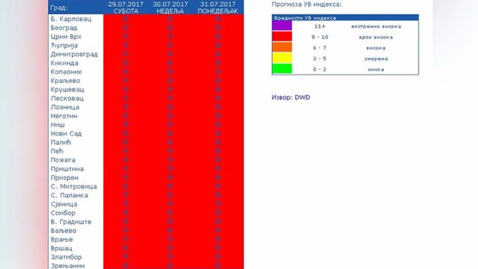 Prognozirani UV indeks takođe upozorava da se narednih dana ne treba direktno izlagati suncu, bar u najtoplijem delu dana.