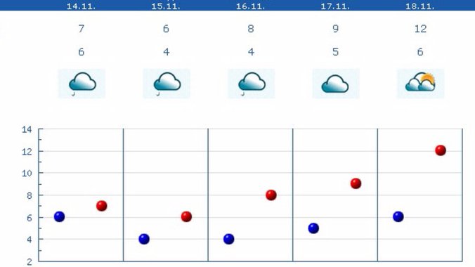 Prema prognozi vremena za narednih sedam dana, u Srbiji će do petka biti oblačno i hladno, mestimično s kišom, na planinama jugozapadne Srbije sa vlažnim snegom uz formiranje snežnog pokrivača, a zatim uglavnom suvo uz manji porast temperature.
