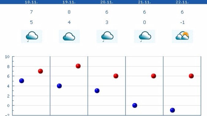 Prema izgledima za narednih sedam dana, do 25. novembra, u nedelju i ponedeljak biće pretežno oblačno, danju uglavnom suvo, a noću i u jutarnjim satima mestimično kiša i susnežica, na planinama sneg.