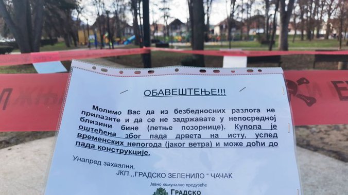 Jak vetar koji je pogodio Čačak nosio je sve pred sobom i čupao drveće iz korena. Usled ove vremenske nepogode nekoliko stabala u Gradskom parku je iščupano iz korena.