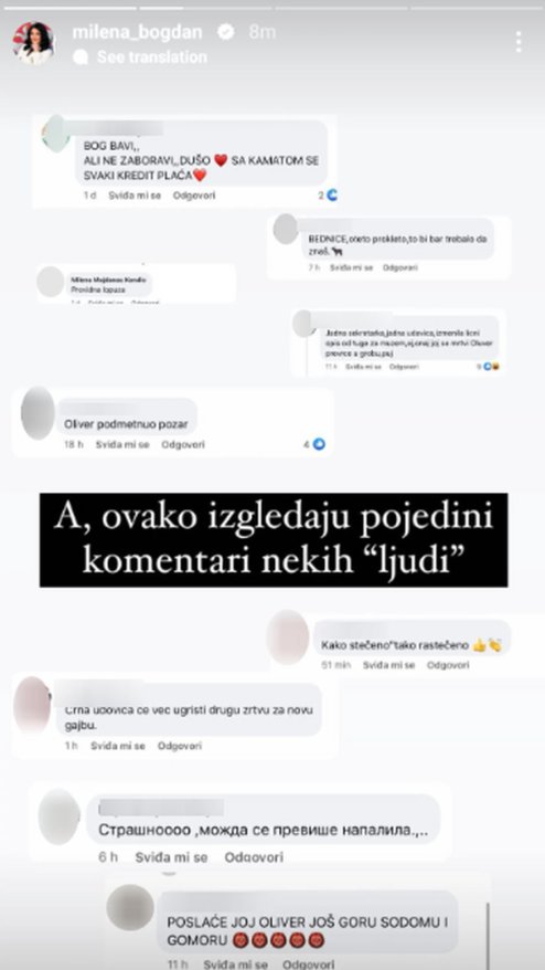- Bogu hvala, mnogo je više onih divnih ljudi koji su uz nas. Hvala im. Ovi ostali, pre ili kasnije nestaće u sopstvenom zlu - napisala je Milena i dodala: