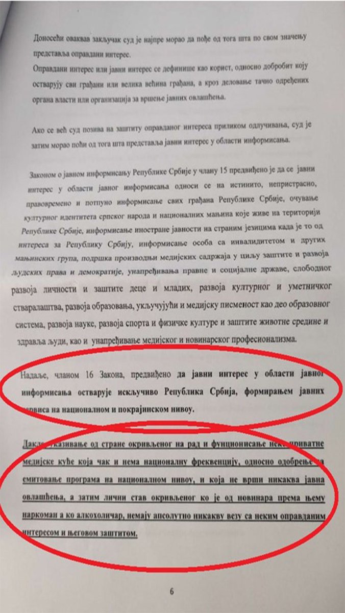 Uz to, Ćosić i Drašković su se u žalbi odlučili na, u advokatskoj etici skandalozan potez, a to je da izvrše falsifikaciju člana 16 važećeg Zakona o javnom informisanju i medijima i ne citirajući ga, poture sudskom veću Višeg suda njegovo izvrnuto značenje kako bi izveli zaključak da se u tom članu zakona govori o tome da javni interes u oblasti javnog informisanja može ostvariti isključivo država. To je, drugim rečima, trebalo da ubedi sudsko veće da nijedan medij ili novinar koga ne finansira država ne može imati nikakve veze sa ostvarivanjem javnog interesa, pa samim tim i da kritika takvih medija i novinara nije u javnom interesu, što je ordinarna glupost.