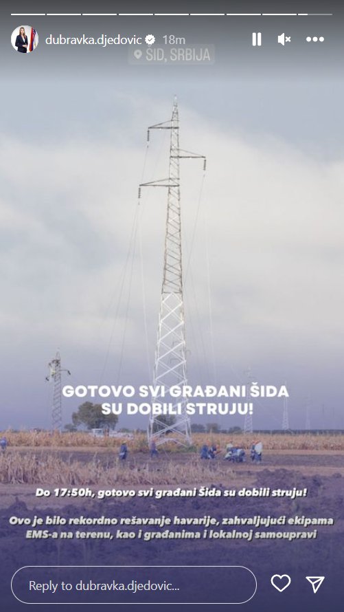 Ministarka rudarstva i energetike Dubravka Đedović Handanović objavila je da su do 17 i 50 sati gotovo svi građani Šida dobili struju.