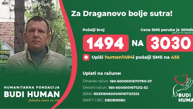 - Boris se za svoj život, i trenutno zavisim od mašine za dijalizu, i 45 hiljada evra moram da skupim za 45 dana. Moja porodica i ja već skupljamo pet meseci, ali bezuspešno, a sada morate i vi. Pošaljite 1494 na 3030 ili uplatite novčana sredstva na moj žiro račun - rekao je Dragan.