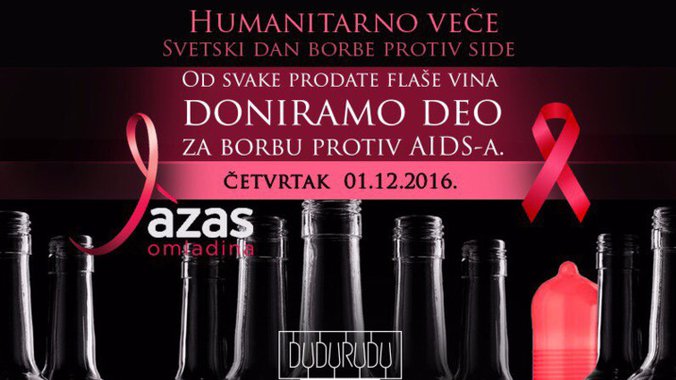 Vaš omiljeni restoran-vinarija “Dudurudu” pripremio je večeras nezaboravni provod za vas povodom obeležavanja 1. decembra - Svetskog dana borbe protiv side.“Dudurudu” i omladina Jazas-a omogućiće vam da uživate u dobrom vinu, ali i da budete humani, jer od svake prodate flaše deo novca ide u humanitarne svrhe.