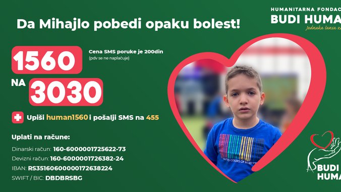 APELUJEMO NA SVE LJUDE DOBRE VOLJE DA U NAJKRAĆEM MOGUĆEM ROKU POKAŽU HUMANOST I POMOGNU MIHAJLU DA SE IZBORI SA OPAKOM BOLEŠĆU!