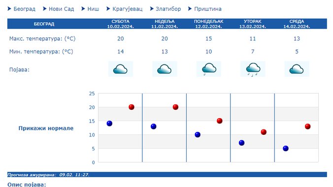 - Do kraja nedelje biće veoma toplo, za vikend kiša i pljuskovi, posebno na jugu regiona. Od nedelje češća pojava kiše uz neznatno zahlađenje. Drugi deo nedelje donosi suvo vreme uz moguće prolazno pogoršanje oko 17. februara, ali nema signala za bilo kakvo konkretnije zahlađenje barem u narednih desetak dana", prognoza je meteorologa amatera Marka Čubrila, koji napominje i da su "svi izneti podaci i procene rezultat njegove obrade i tumačenja numeričkih modela, a za zvanične informacije treba pratiti državne prognostičke zavode".