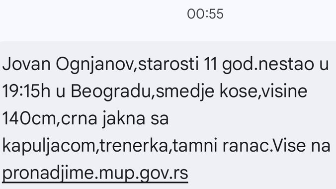 Dečak Jovan Ognjanov, starosti jedanaest godina nestao je 16.12.2024. godine oko 19 časova kod Osnovne škole „Branko Radičević“ na Novom Beogradu. Smeđe kose, smeđih očiju, visine oko 140 cm. Na sebi je u trenutku nestanka imao crnu jaknu sa kapuljačom, tamnu trenerku, tamno sive čizme, šareni ranac tamnijih boja.
