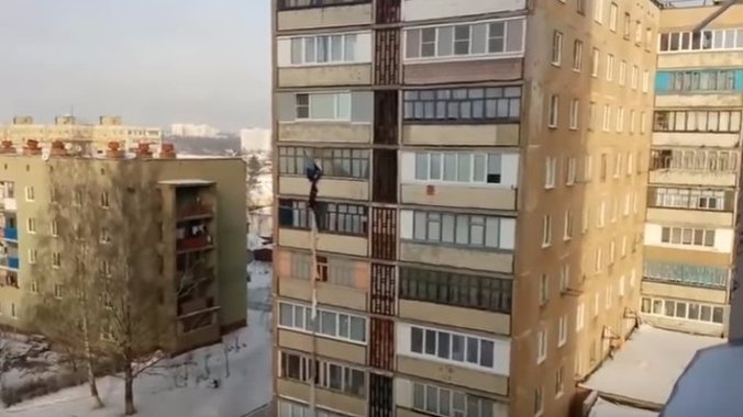 Kamere su zabeležile muškarca koji pokušava da se spusti kroz prozor zgrade, strahujući, verovatno, od ljubavničinog supruga.