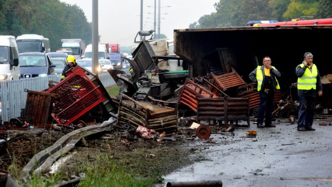 Do nesreće je došlo danas kad se kamion sa prikolicom beogradskih tablica prevrnuo, udario i probio ogradu autpouta, a metalne konstrukcije koje je prevozio rasule se po autputu.