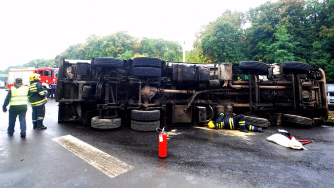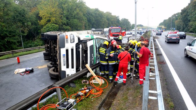 U blizini pumpe "Zmaj" na autoputu Beograd - Zagreb dogodila se teška saobraćajna nesreća, prevrnuo se kamion, a vatrogasci su vozača koji je ostao zarobljen u kabini uspeli da izvuku iz olupine.