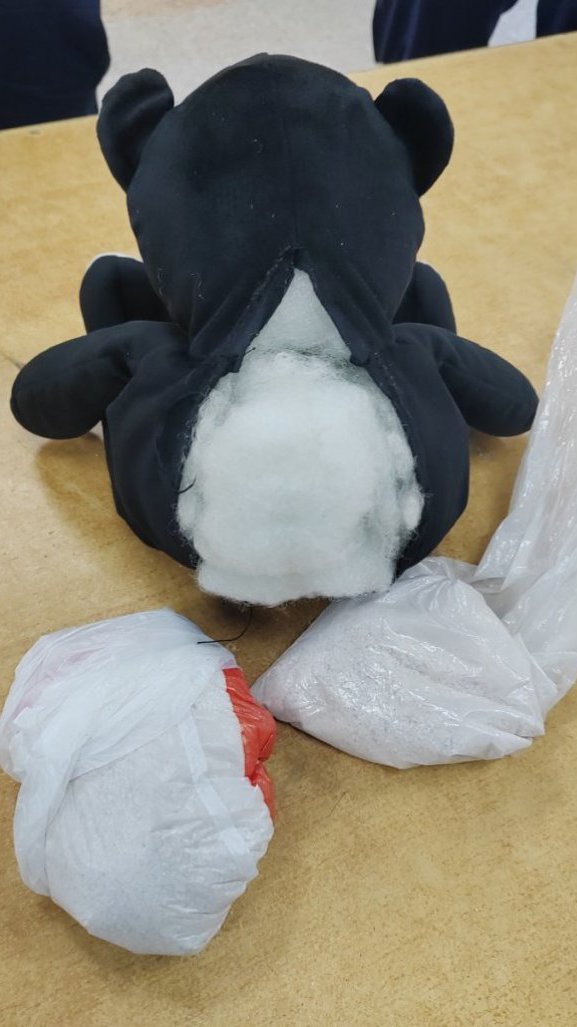 Ispostavilo se da sumnja bila opravdana, jer kada je igračka rašivena, u njoj je pronađena kesa sa belom kristalnom materijom, koja je priručnom analizom odreagovala na sintetičku drogu metamfetamin.