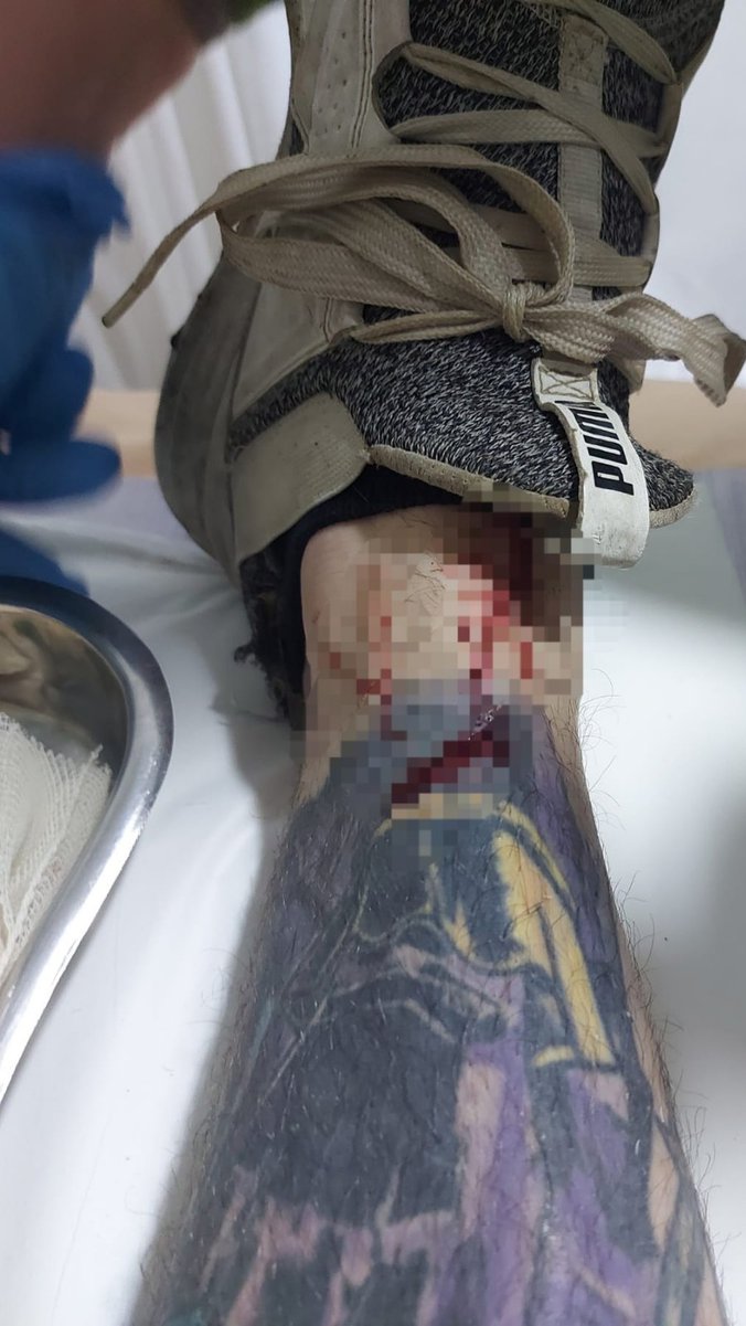 Kao što se može videti na fotografiji, Dušan je zadobio jezivu povredu noge.