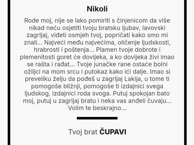 - Rode moj, nije se lako pomiriti sa činjenicom da više nikada neću osetiti tvoju bratsku ljubav, lavovski zagljaj, videti osmeh tvoj, popričati kako smo mi znali... Najveći među najvećima, oličenje ljudskosti, hrabrosti i poštenja... Plamen tvoje dobrote i plemenitosti goreće doveka, a ko doveka živi imao se rašta i rađati... Tvoje junačke rane ostaće bolni ožiljci na mom srcu i putokaz kako ići dalje. Imao si preveliku želju da pođeš u zagrljaj Lakija, u tome ti pomogoše bližnji, pomogoše ti izdajnici svega ljudskog, izdajnici roda svoga. Putuj spokojan bato moj, putuj u zagrljaj bratu i neka vas anđeli čuvaju... Volim te beskrajno, tvoj brat Čupavi - jedna je od poruka ubijenom Nikoli.