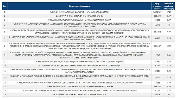 Lista Srbija protiv nasilja osvojila je 22,86 odsto glasova, Socijalistička partija Srbije - 6,67, izborna lista Nada za Srbiju ima 4.94 odsto, lista "Mi - glas iz naroda - Branimir Nestorović" - 4,63, a Milica Đurđević Stamnekovski - Boško Obradović 2,8 odsto glasova.