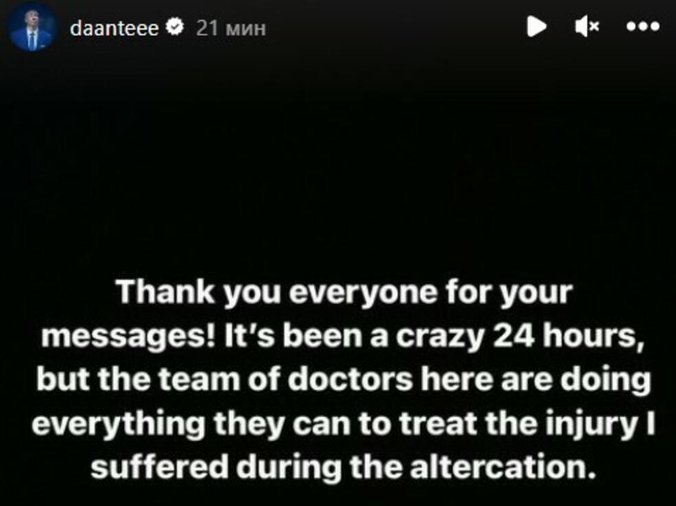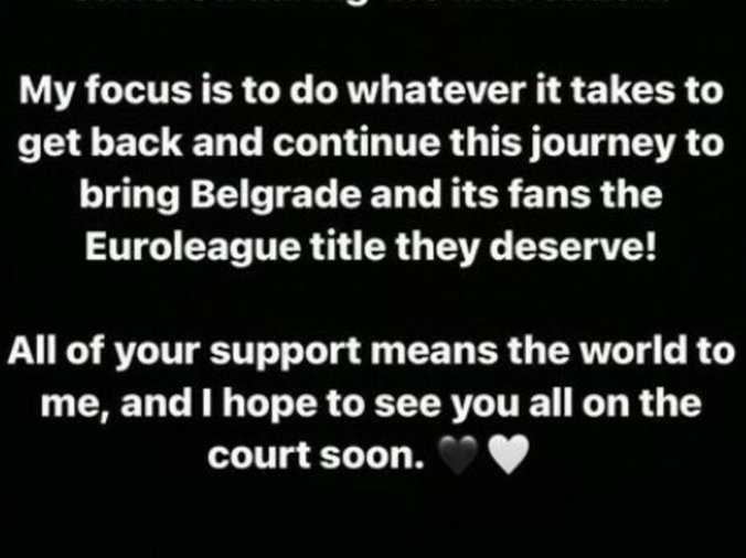 "Hvala svima za poruke. Ovo su bila luda 24 sata, ali doktorski tim ovde radi sve što može da zaleči povredu koju sam zadobio tokom svađe. Moj fokus je da uradim sve da bih se vratio i nastavio ovo putovanje da donesem Beogradu i našim navijačima evroligašku titulu koju zaslužuju. Sva vaša podrška znači sve za mene i nadam se da se vidimo na terenu uskoro", napisao je Eksum.