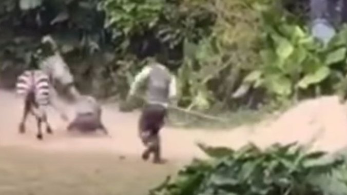Prikazana je razjarena životinja kako vuće nesrećnog čoveka uhvativši da zubima za rame. U međuvremenu stižu i drugi zaposleni i motkama pokušavaju da oteraju zebru.