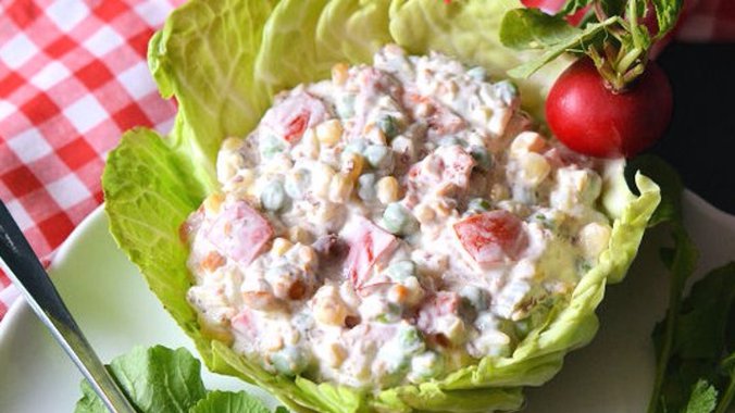 Grašak i kukuruz obariti (ako nisu iz konzerve), a kikiriki i papriku sitno iseckati. Dodati proceđen, ohlađeni pirinač i majonez. Sve promešati i po ukusu posoliti ali vodite računa da je kikiriki već slan.
