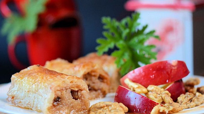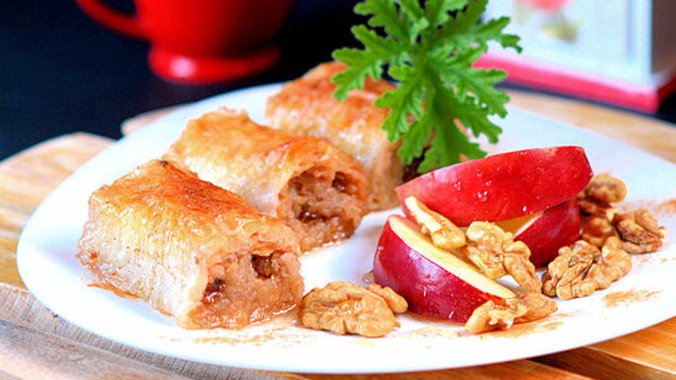 Jabuke oljuštite i izrendajte. Propržite (na suvo) da tečnost iz jabuka ispari. Sklonite sa vatre i dodajte mlevene orahe, suvo grožđe i cimet.
