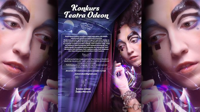 Da bi baš ti postao deo tima Teatra Odeon fakultet ili akademija nisu presudni – jedini uslovi jesu talenat, posvećenost, mnogo pozitivne i kreativne energije. Politička pripadnost i urgencija bilo koje vrste na ovom konkursu neće biti od pomoći, a da biste postali deo teatra Odeon , potrebno je samo da posaljete CV i Showreel vašeg rada na mail adresu: teatarodeon@gmail.com