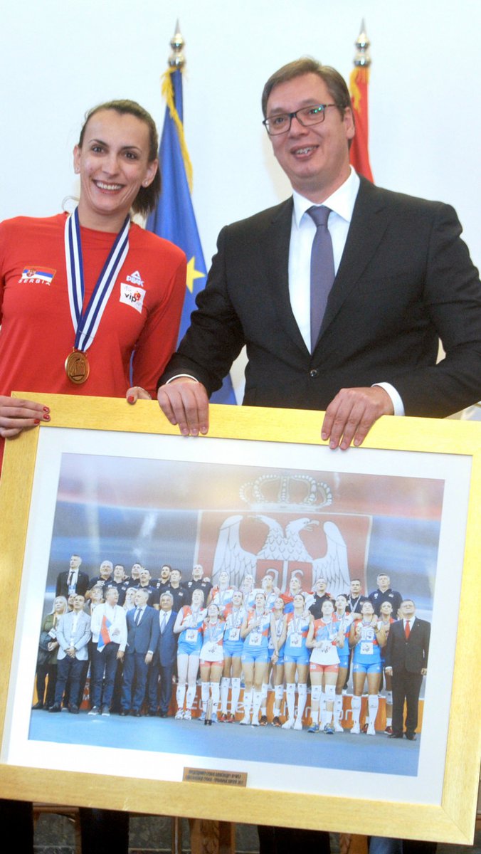 Vučić je od kapitena odbojkašica Milene Rašić dobio uramljenu sliku reprezentacije sa postolja u Bakuu.