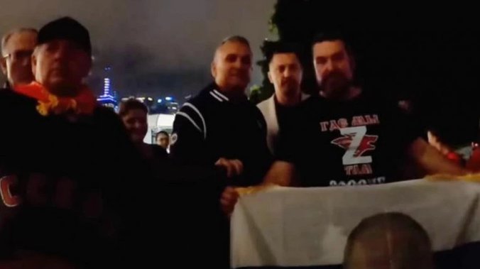 - Grupa navijača u srpskim bojama istakla je rusku zastavu sa Putinovim likom ispred Rod Lejver arene. Uzvikujući podršku Rusiji, neki su imali zastavu Srbije omotanu oko ramena.