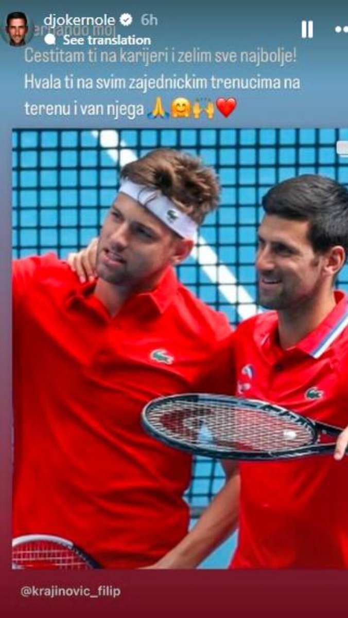Nole je poslao emotivnu poruku Filipu Krajinoviću, koji je u utorak saopštio da je završio svoju profesionalnu tenisku karijeru.