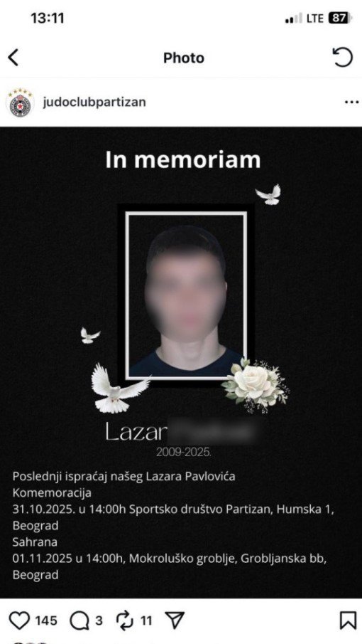 Džudo klub Partizan se još jednom oprostio od svog stradalog džudiste Lazara P., najavivši i komemoraciju posvećenu svom uspešnom sportisti.