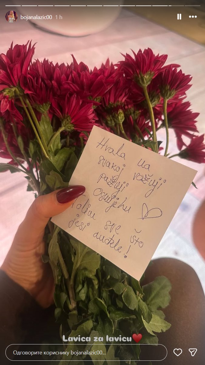Ovaj buket ona je dobila od koleginice, voditeljke, takođe "Pinkovih zvezda", Anđele Ašanin koja se nalazi u bekstejdžu ove emisije, te je na ovaj način htela da joj se zahvali na svemu što je Bojana uradila za nju, kao i da joj izmami osmeh na lice, u čemu je uspela.