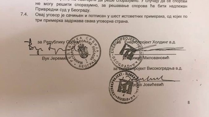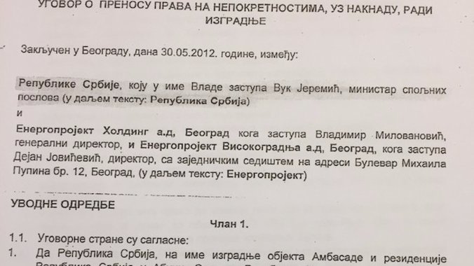 Ugovor o prenosu prava na nepokretnostima koji je u MSP zaveden pod brojem 3043-19/16, do čije kopije je došla Medijska mreža Antidot, u samoj završnici svog mandata na mestu šefa diplomatije, u ime Ministarstva potpisao je Vuk Jeremić. U ime „Energoprojekt Holdinga“ i „Energoprojekt Visokogradnje“ ugovor su potpisali direktori tih kompanija Vladimir Milovanović i Dejan Jovićević.