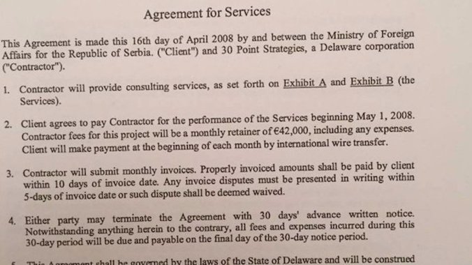 Bez nabrajanja pojedinačnih usluga i njihove cene, Srbija se ugovorom obavezala da firmi „30 Point Strategies“ mesečno plaća 42 hiljade evra uz obavezu američkog partnera da obezbedi „merljivost i vidljivost ostvarivanja zadatih ciljeva“ kroz mesečno praćenje njihove realizacije, s tim da Vladi Srbije nikada nije dostavljen ni jedan izveštaj o postignutim rezultatima!