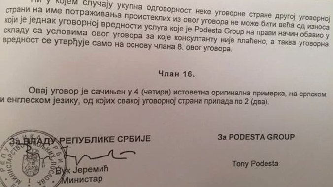 Tajnim ugovorom, koji su potpisali Vuk Jeremić i Toni Podesta, a do čije je kopije došla Medijska mreža Antidot, bilo je predviđeno da za 100 hiljada dolara mesečno (!?) „Podesta Group“ pruži Republici Srbiji nespecifikovane usluge savetovanja (lobiranja) usmerene na ostvarivanje „strateških interesa“ zvaničnog Beograda koji su se ogledali u “poboljšanju političkih i ekonomskih odnosa sa Sjedinjenim Američkim Državama”, odnosno “unapređenju diplomatskih odnosa i povećanju investicija i trgovine” između dve zemlje. Podesta je tom prilikom preuzela obavezu preduzimanja svih neophodnih aktivnosti u cilju “onemogućavanja delovanja trećih lica koja mogu naneti šetu ugledu ili interesima Republike Srbije”.