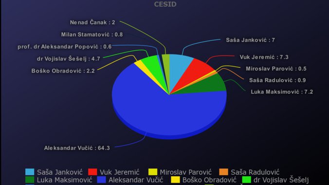 21-36 - CeSID najavio: NEMA DRUGOG KRUGANa osnovu 76.2 uzorka Aleksandar Vučić ima 55.8 odsto glasova, Saša Janković 15.5, Luka Maksimović 9.4, Vuk Jertemić 5.8, Vojislav Šešelj 4.5, Boško Obradović 2.2, Saša Radulović 1.3, Aleksandar Popović 1.1, Nenad Čanak 1.1, Milan Stamatović 1.0, Miroslav Parović 0.3.