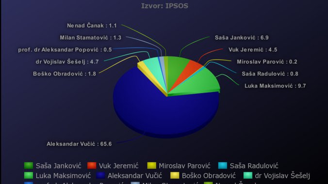 21-36 - CeSID najavio: NEMA DRUGOG KRUGANa osnovu 76.2 uzorka Aleksandar Vučić ima 55.8 odsto glasova, Saša Janković 15.5, Luka Maksimović 9.4, Vuk Jertemić 5.8, Vojislav Šešelj 4.5, Boško Obradović 2.2, Saša Radulović 1.3, Aleksandar Popović 1.1, Nenad Čanak 1.1, Milan Stamatović 1.0, Miroslav Parović 0.3.