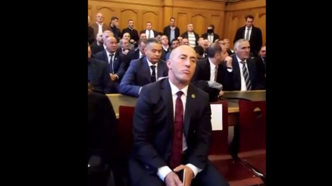 9.00 - Ramuš Haradnij stigao je u zgradu suda i očekuje se početak sednice. Dok je čekao početak sednice Haradinaj je sedeo i listao papire, nešto zapisivao, sa ozbiljnim licem nešto zapisuje.