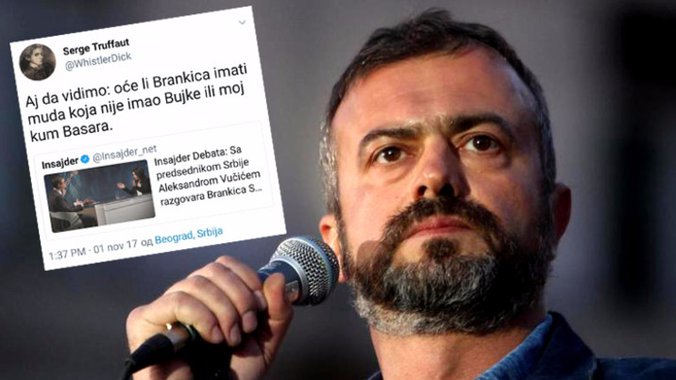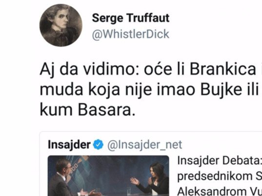 - Ajd da vidimo: oće li Brankica imati muda koja nije imao Bujke ili moj kum Basara - napisao je on i retvitovao najavu za Insajder debatu koja će biti emitovana u petak.