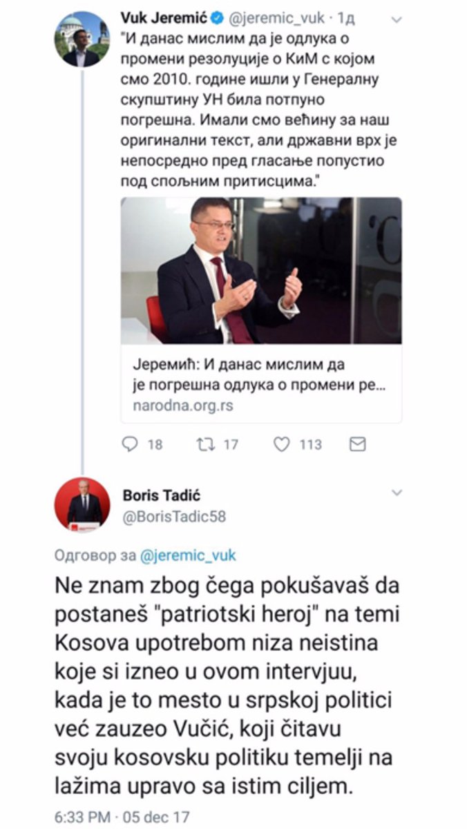 Nekadašnji predsednik Srbije Boris Tadić ponovo je reagovao na intervju Vuka Jeremića za portal Fakti u kojem se navodi da je bila pogrešna odluka tadašnjeg državnog vrha da prvobitno pripremljen tekst rezolucije zameni novim, kompromisnim, pripremljenim u dogovoru sa EU.