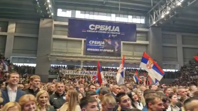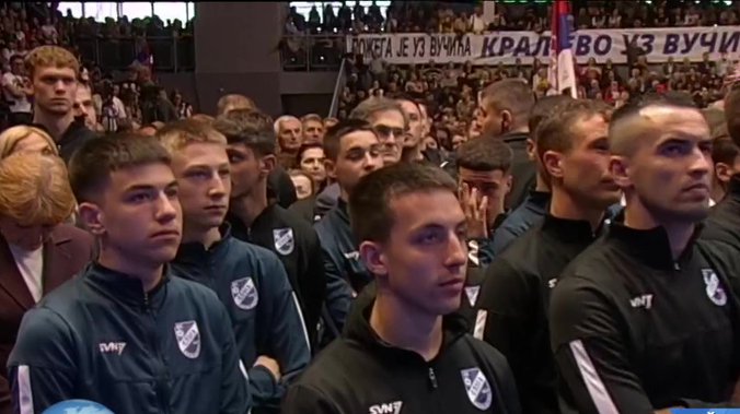 Nakon intoniranja himne Srbije u prepunoj sportskoj dvorani u Kraljevu građanima se obratio predsednik Vučić.