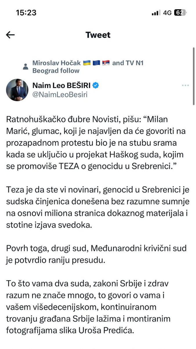 Naim Leo Beširi, jedan od ideologa protesta u Srbiji napao sve koji osuđuju večerašnjeg govornika Milana Marića jer je izjavio je u Srebrenici počinjen genocid.