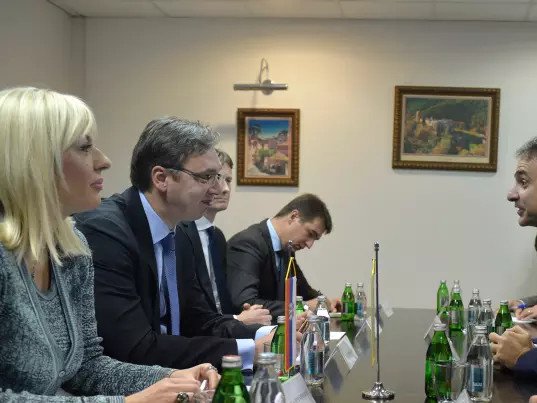 Predsednik Srpske napredne stranke Aleksandar Vučić sastao se u Beogradu sa delegacijom grčke stranke Nova demokratija, koju predvodi lider stranke Kirijakos Micotakis.