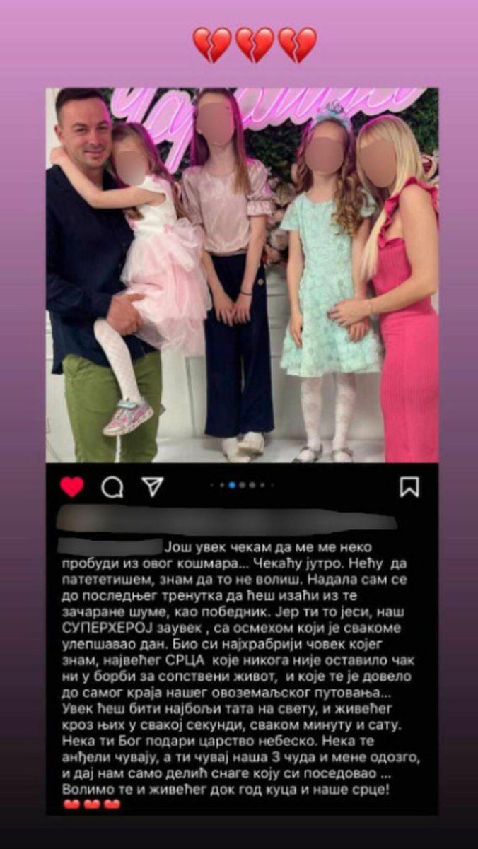 "Još uvek čekam da me neko probudi iz ovog košmara... Čekaću jutro. Neću da patetišem, znam da to ne voliš. Nadala sam se do poslednjeg trenutka da ćeš izaći iz te začarane šume, kao pobednik. Jer ti to jesi, naš SUPERHEROJ zauvek, sa osmehom koji je svakome ulepšavao dan. Bio si najhrabriji čovek kojeg znam, najvećeg SRCA koje nikoga nije ostavilo, čak ni u borbi za sopstveni život, i koje te je dovelo do samog kraja našeg ovozemaljskog putovanja... Uvek ćeš biti najbolji tata na svetu, i živećeš kroz njih u svakoj sekundi, svakom minutu i satu. Neka ti Bog podari carstvo nebesko. Neka te anđeli čuvaju, a ti čuvaj naša 3 čuda i mene odozgo, i daj nam samo delić snage koju si posedovao... Volimo te i živećeš dok god kuca i naše srce!"