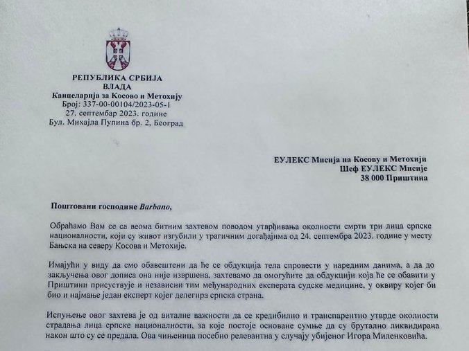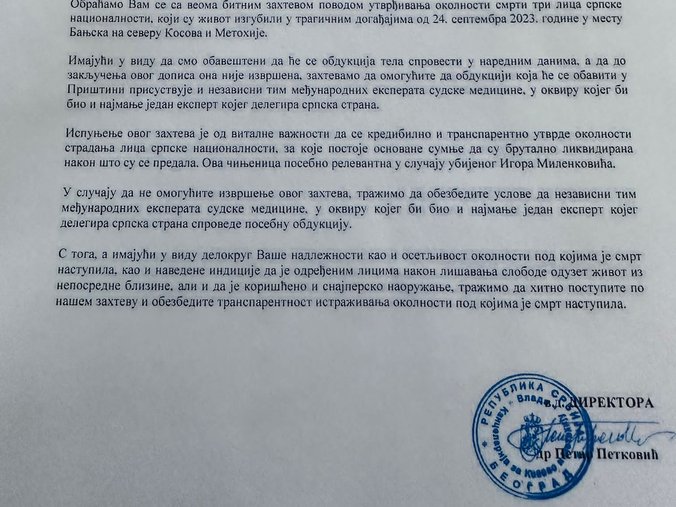 "Obraćamo vam se sa veoma bitnim zahtevom povodom utvrđivanja okolnosti smrti tri lica srpske nacionalnosti, koji su život izgubili u tragičnim događajima od 24. septembra 2023. godine u mestu Banjska na severu Kosova i Metohije.