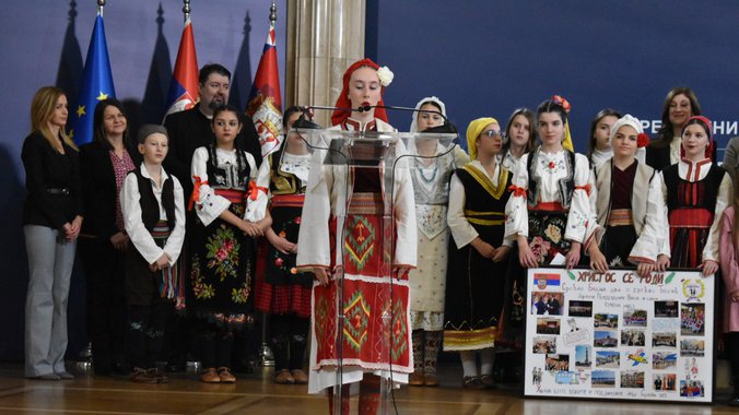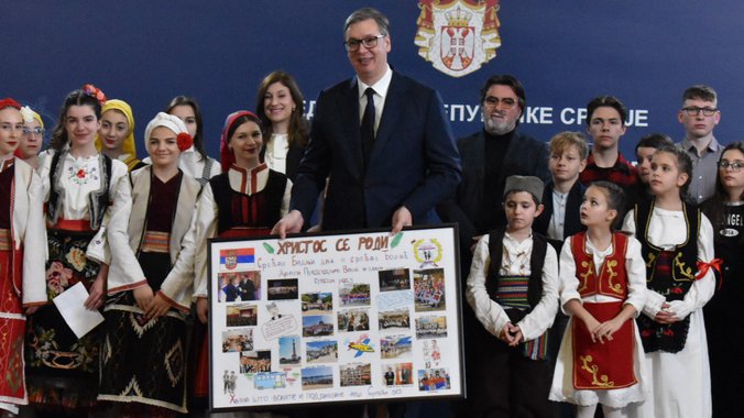 - Draga deco i učitelji, vaspitači, nastavnici. Hvala vam što ste danas u Beogradu, u Srbiji. Svima koji dolazite iz Skoplja, Kumanova, Bitolja, Tetova, srećan sam što na Badnji dan mogu da vas ugostim. Čini mi se da je vladika Nikolaj Srbima najbolje opisao Božić - rekao je predsednik Vučić tokom prijema, nakon čega je pročitao reči vladike Nikolaja.